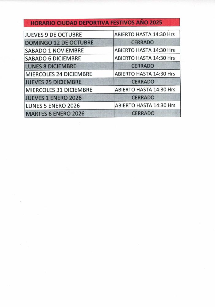 HORARIO CIUDAD DEPORTIVA FESTIVOS 2025