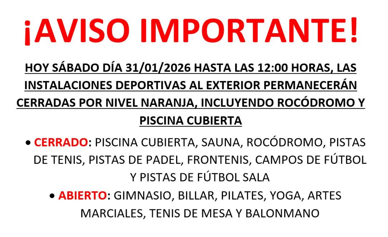 ¡AVISO IMPORTANTE! SÁBADO DIA 31 DE ENERO - ALERTA NARANJA